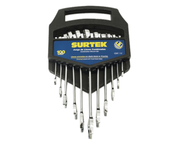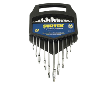 Juego de llaves combinadas en rack con 11 piezas metricas, de cromo con acabado satinado.