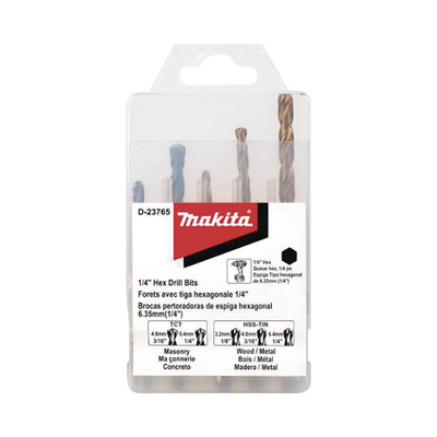 Juego de 5 Brocas con Inserción Hexagonal de 1/4". De concreto: 3/16" y 1/4". Para metal: 1/8", 3/16" y 1/4".