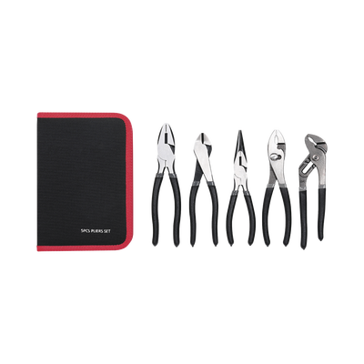 / Juego de 5 Pinzas de 8″ con Estuche. Incluye: P. Mecánica, P. para Tubo, P. Eléctrica, P. Corte, Nariz Larga.