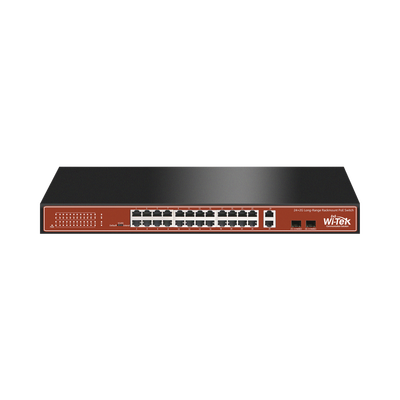 / Switch PoE (802.3af/at) no administrable de largo alcance, hasta 250m, con 24 x 10/100Mbps + 2 x SFP Gigabit Combo, 250 W