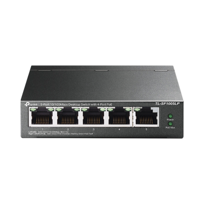 Switch PoE no Administrable de escritorio 5 puertos 10/100 Mbps, 4 puertos PoE, 41 W, modo extensor PoE hasta 250 metros.